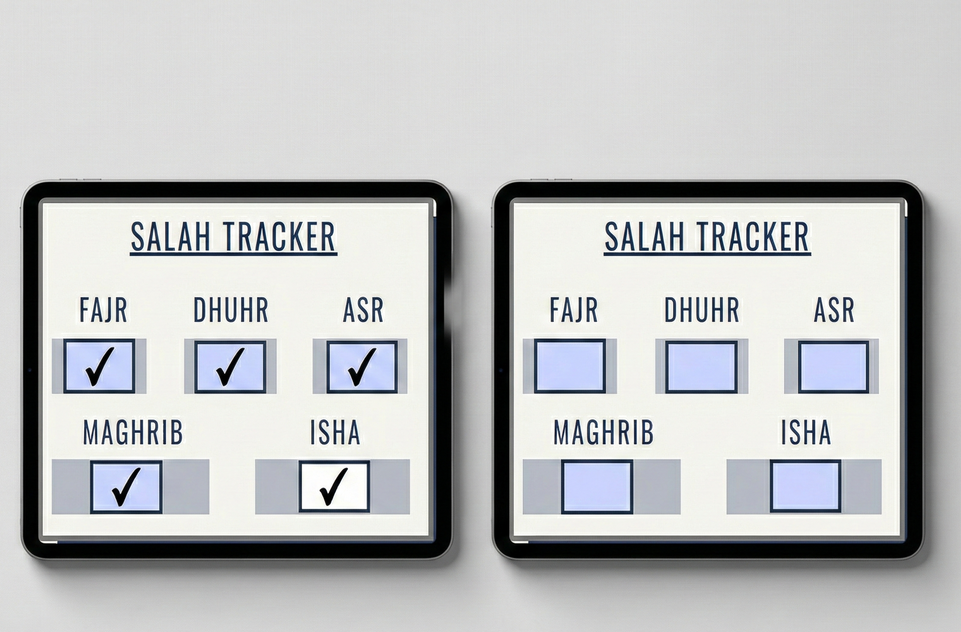 • Salah tracker (Fajr, Dhuhr, Asr, Maghrib, Isha)